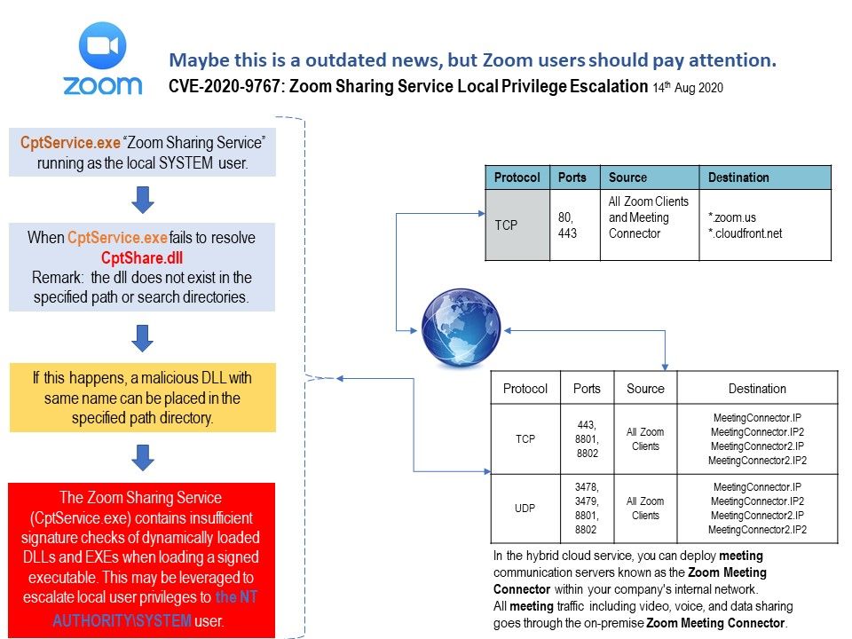 Recently News: In June 10, 2020 (about 4 months ago). Found that Zoom Sharing Service (Cptservice[.]exe) contains insufficient signature checks of dynamic loaded DLLs and EXEs when loading a signed executable. Such design weakness allow an attacker who had local access to a machine on which the service was running with elevated privileges to elevate their system privileges as well through use of a malicious DLL. NVD Published this vulnerability on 14th Aug 2020. Perhaps quite a lot of users already received alert. For those who do not know. You should upgrade the software immediately.