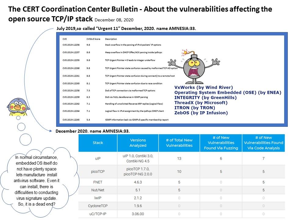 Limitation: In normal circumstance, embedded OS itself do not have plenty space lets manufacture install antivirus software. Even it can install, there is difficulties to conducting virus signature update. So, it is a dead end?