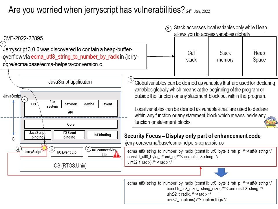See whether the attached diagram give you a quick idea of the vulnerability? Also, some vulnerabilities were found in jerryscript. See below for details: