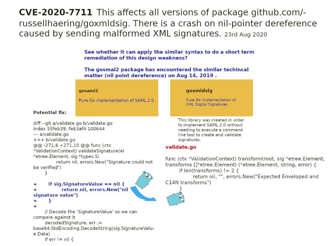 Remedy: Official announcement not announce yet. See whether it can apply the similar syntax to do a short term remediation of this design weakness? The gosmal2 package has encountered the similar technical matter (nil point dereference) on Aug 14, 2019 . For more details, please refer to diagram.