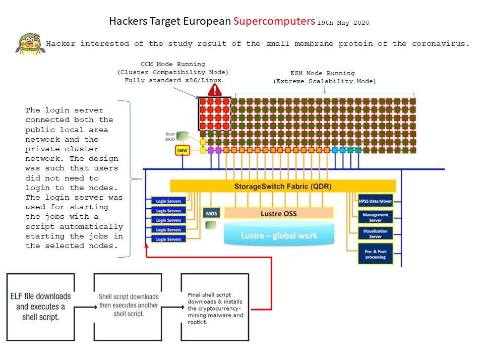 Details: It is true. For instance, Cray has Cluster compatibility mode.It is a standard x86/Linux environment. Several affected labs said that only the login portal to the supercomputer were affected, said Swissinfo.ch. Because hacker will be more interested of scientific research result in this period of time. In this case, how the attacker tried to infect the supercomputer. Please refer to the attached drawing. As usual, the attack entry point is the login portal. But the attacker should infect the client workstation on the beginning phase. For example Cryptocurrency mining malware shell script will be saved as /bin/httpdns. A scheduled task is created to run /bin/httpdns every hour. But it need to take the right time to land the script.