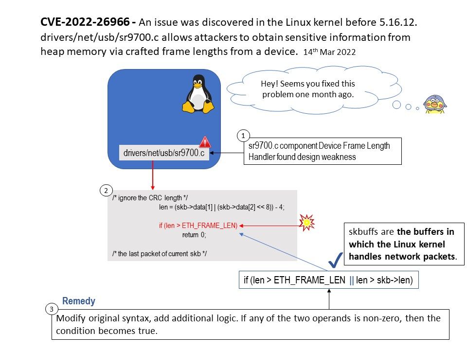 Vulnerability details: An issue was discovered in the Linux kernel before 5.16.12. drivers/net/usb/sr9700[.]c allows attackers to obtain sensitive information from heap memory via crafted frame lengths from a device.