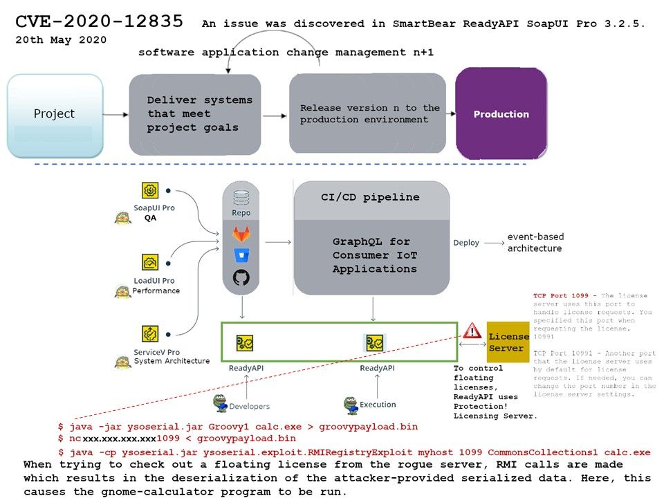 Vulnerability details: The security expert found a possible way to conduct cyber attack. When a insider threat occurs. The threat prepatrator can be figure out the target license setup condition. If victim deployed remote floating license setup by ReadyAPI. They will exploit the design weakness for Licensing Server. Since the communications in between SmartAPI and license server is using Java RMI protocol on port 1099 but without transport security. Meanwhile, Java RMI, and the underlying JRMP protocol, relies on Java serialization to transport method arguments, return values and exception data intensively. And therefore the problem is that there’s no way to know what you’re deserializing before you’ve decoded it. So an attacker can serialize a bunch of malicious objects and send them to your application.