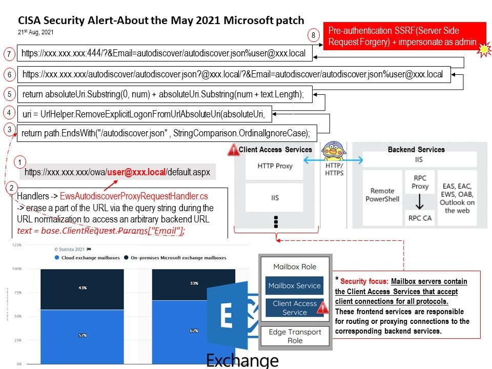 Point of view: Perhaps quite a lot of people will be surprised of this notification. Since more and more organizations has been migrated the mail server to office 365. The patch issued on May 2021 was applied already. But the patch management from small to medium firm not easy to managed. It is quite common that a one I.T. technical support person supporting everything. It is unbelievable but it is factual. You can see a lot of large size mailbox not being managed. Furthermore, the patch management may not do it immediately. It wait for their schedule time window to do the patch management. As a result, before they conduct patch management. Attacker may landed to their email server. Apart of lack of SIEM facility, only relies on a single firewall is hard to defense such vulnerability attack. Or you will say, will the local OS antivirus can be do the detection. The answer is that if the antivirus feature do not involve to content security filter function. Therefore the attack might have chance to do the evasion . I believe that CISA on their malware sink hole infrastructure will see the details. And this is the objective of this alert.