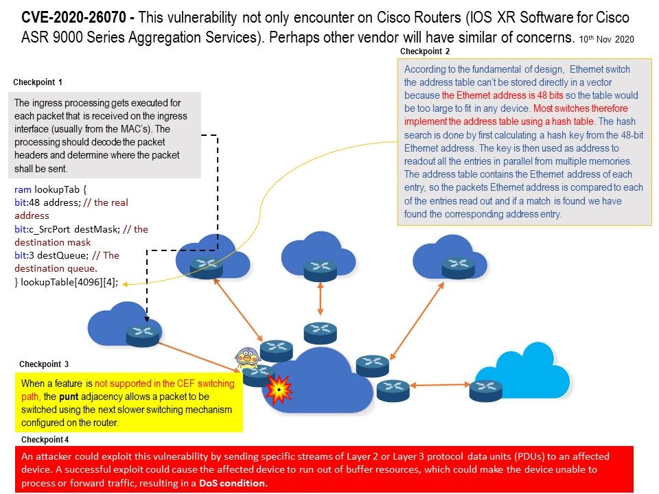 Current known factors: A vulnerability in the ingress packet processing function of Cisco IOS XR Software for Cisco ASR 9000 Series Aggregation Services Routers could allow an unauthenticated, remote attacker to cause a denial of service (DoS) condition on an affected device. For more details. please refer to url – https://tools.cisco.com/security/center/content/CiscoSecurityAdvisory/cisco-sa-xr-cp-dos-ej8VB9QY