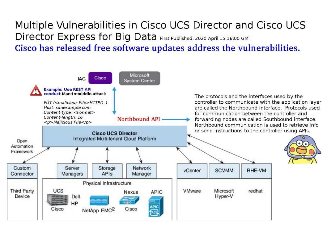 Vulnerability details: Multiple vulnerabilities in the REST API of Cisco UCS Director and Cisco UCS Director Express for Big Data may allow a remote attacker to bypass authentication or conduct directory traversal attacks on an affected device. For details, please refer official announcement – https://tools.cisco.com/security/center/content/CiscoSecurityAdvisory/cisco-sa-ucsd-mult-vulns-UNfpdW4E