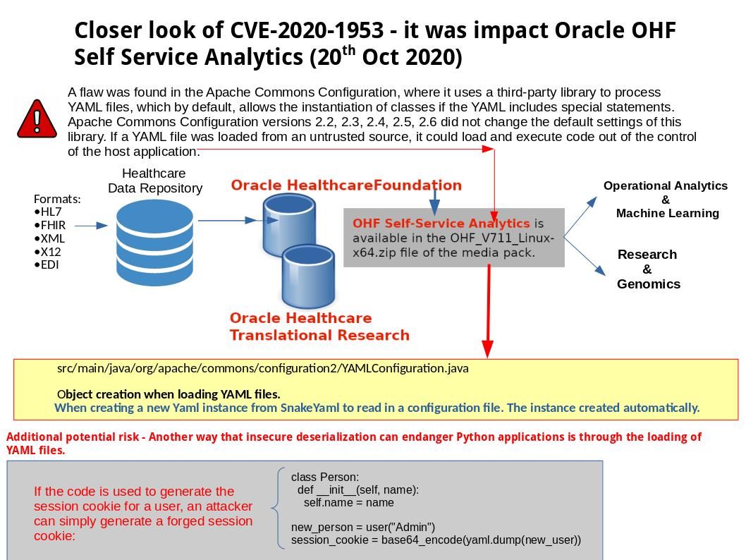 Vulnerability details: YAML is a human-readable data serialization standard that can be used in conjunction with all programming languages and is often used to write configuration files. A flaw was found in the Apache Commons Configuration, where it uses a third-party library to process YAML files, which by default, allows the instantiation of classes if the YAML includes special statements. Oracle Healthcare Foundation Self-Service Analytics was impact by this vulnerability.