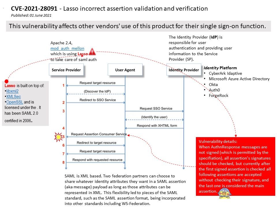 Vulnerability details: Lasso incorrect assertion validation and verification. When AuthnResponse messages are not signed (which is permitted by the specification), all assertion’s signatures should be checked, but currently after the first signed assertion is checked all following assertions are accepted without checking their signature, and the last one is considered the main assertion.