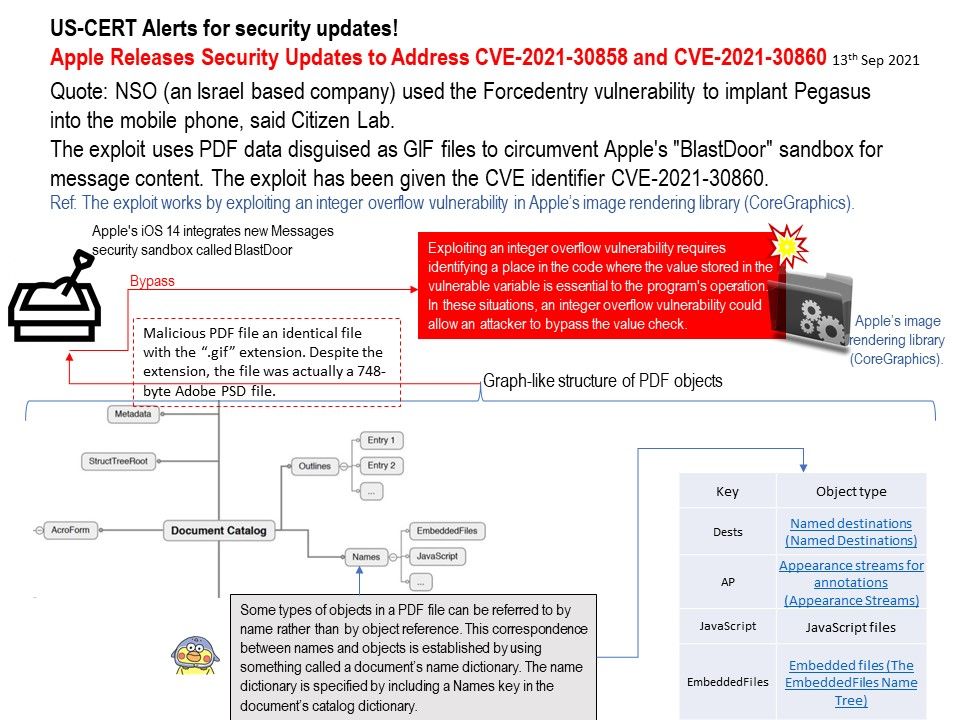 Vulnerability details: The exploit uses PDF data disguised as GIF files to circumvent Apple’s “BlastDoor” sandbox for message content. The exploit has been given the CVE identifier CVE-2021-30860.