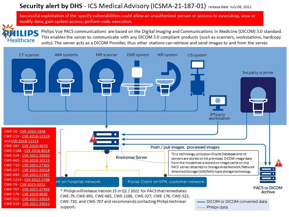 Vulnerability details: Philips Vue PACS design require to work with Redis and Oracle. This technology utilizes an Oracle Database and its servers are stored on VA premises. DICOM image data from the modalities is stored on image cache on the PACS server attached to Storage Area Network/Network Attached Storage (SAN/NAS)-type storage technology. However it was discovered design limitation in both software. Meanwhile the software application itself also discovered different vulnerabilities.