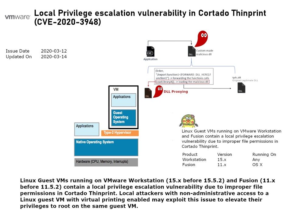 Vulnerability details: Linux Guest VMs running on VMware Workstation (15.x before 15.5.2) and Fusion (11.x before 11.5.2) contain a local privilege escalation vulnerability due to improper file permissions in Cortado Thinprint. Local attackers with non-administrative access to a Linux guest VM with virtual printing enabled may exploit this issue to elevate their privileges to root on the same guest VM. For the details of attack. Please refer to diagram.