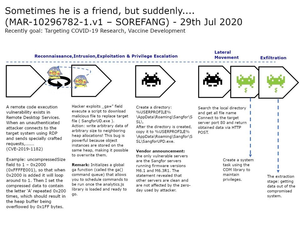 Description: Perhaps my research does not clearly reflect the actual status of the current malicious goal. However every people is looking for vaccine. My personal interest bring my attention to a malware so called “SOREFANG”. It looks that a vendor became a victim of this case. It was because attacker or APT group do a re-engineering their VPN software. As a matter of fact, their company footprint a large in China. The details of my observation and research are written down on attached diagram. For those who is interested. Please refer attached diagram for reference.