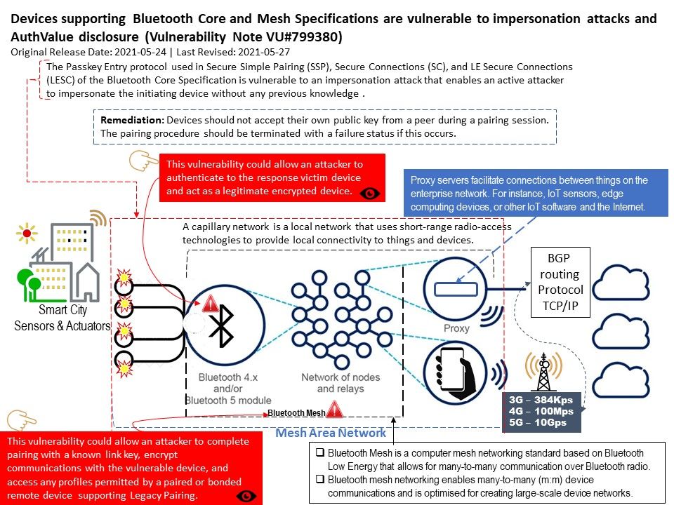 Vulnerability details: Devices supporting Bluetooth Core and Mesh Specifications are vulnerable to impersonation attacks and AuthValue disclosure. For more detail, please refer url – https://kb.cert.org/vuls/id/799380