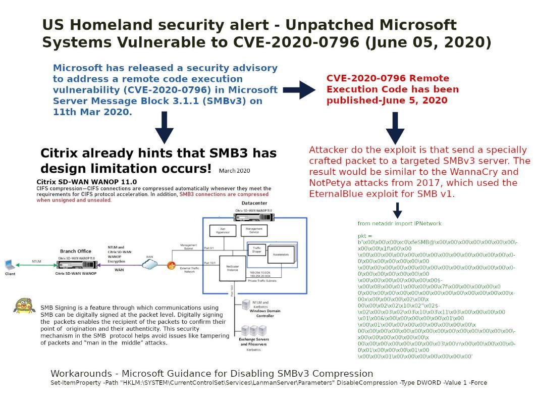 Synopsis: The proof of concept code vulnerability has been made public. Attacker do the exploit is that send a specially crafted packet to a targeted SMBv3 server. (refer to attached diagram). The result would be similar to the WannaCry and NotPetya attacks from 2017, which used the EternalBlue exploit for SMB v1.