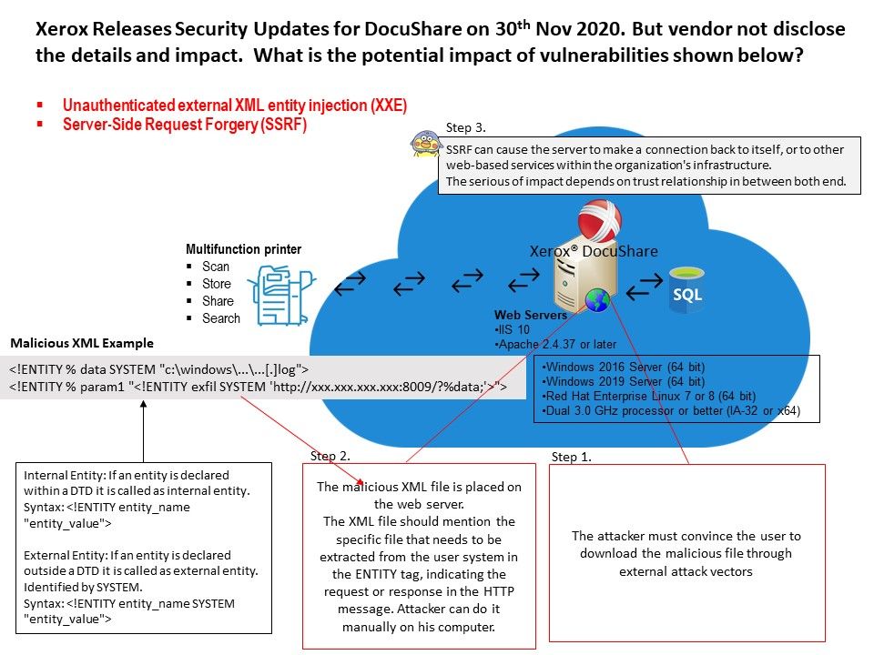Vulnerability details: When applications use XML to transport data between browser and server, the applications almost always use a a standard API for processing the XML on the server. Vulnerabilities arise because parsers will, by default, process potentially dangerous features. DocuShare server encountered server-side request forgery (SSRF) attacks and unauthenticated external XML entity injection attacks (XXE). The overall impact could expose DocuShare users to an attack resulting in the loss of sensitive data. Meanwhile, Docushare server had server-side request forgery vulnerability occur. SSRF can cause the server to make a connection back to itself, or to other web-based services within the organization’s infrastructure. The serious of impact depends on trust relationship in between both end.