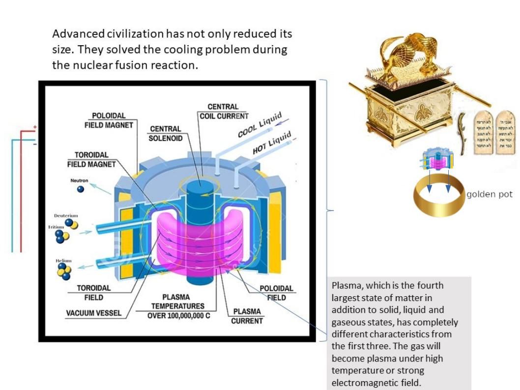 But I speculated that the the golden pot store in the ark is the minimized nuclear power generator. Our civilization know how to utilize the nuclear power technologies since 40’s. The well known matters is the Manhattan Project. Robert Oppenheimer which use Albert Einstein theory to invent the Atomic bomb. Our experience in this nuclear technology area was less than hundred years. For example, fusion reaction technique (see below diagram) can generate huge volume of electricity power. However the extreme temperature generated during reaction is the problem which make them headache. Furthermore the size of the facilities are huge big. The advanced civilization even know how to pass through the milky way. And therefore they know how to minimized the overall size of nuclear facility. This is not surprising.