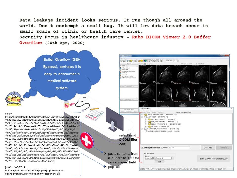 Recent security alert on medical product: The ‘DICOM Viewer 2.0’ capable of handling all DICOM files of any modality (X-Ray angiogram, ultrasound, CT, MRI, Nuclear, waveform etc.), compression (lossless and lossy Jpeg, Jpeg200, RLE), depth or color. The proof of concept shown that software encountered buffer overflow (SEH) in specify circumstances.