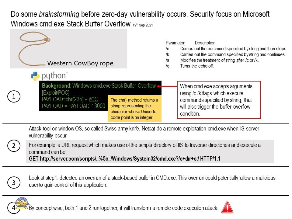 Vulnerability details: Expert found that special crafted payload will trigger a Stack Buffer Overflow in the NT Windows “cmd[.]exe” commandline interpreter. Furthermore, running file type especially [dot]cmd or [bot]bat will be risky. However, when cmd[.]exe accepts arguments using /c /k flags which execute commands specified by string, that will trigger the buffer overflow condition.